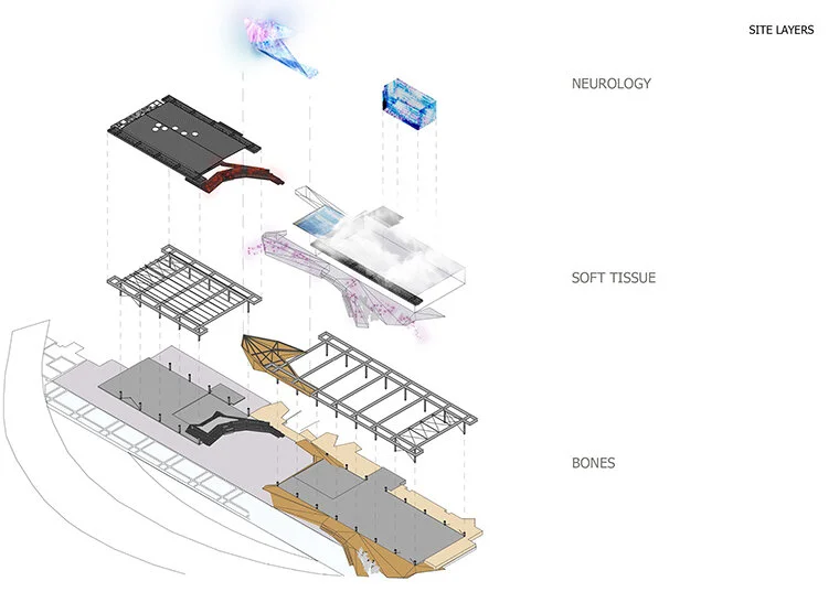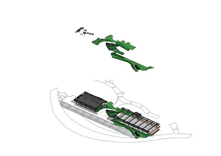 Walkway – provides elegant access to the southern pavilion and creates seating facing the arbour which can be activated with projection. Made from re-purposed Z-purlins and clad in expanded mesh, the structure uses all existing footings and sub structure where possible. Awning – a beacon to attract people to the site. It provides shade and multiple projection surfaces. The form attaches to the framing as a nest or cocoon fixes to a branch. Existing planter boxes – these elegant precast concrete forms could be core hole drilled for drainage, shadow and light play.