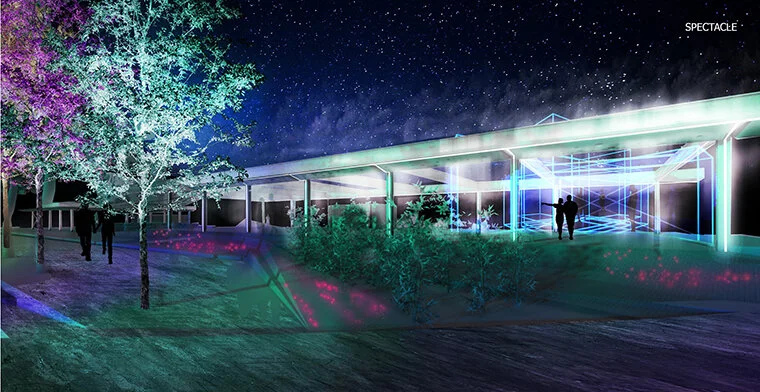 The site at dusk – responsive LED embers, soundscape and programmable tree illumination. Mist and LED installation by guest artistic company delineates the southern pavilion structure.