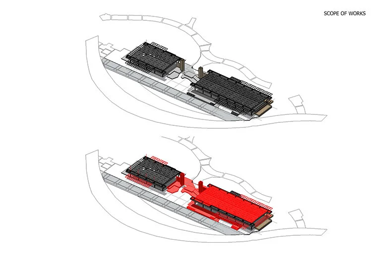 The scheme supports a promise of what is to come; a dynamic, worldclass, technologically and community engaged site. This is an interim strategy with a heart-beat, a responsive site hosting audiences day and night throughout a year long metamorphosis. The intervention is designed to optimise audience and performer relationships.
